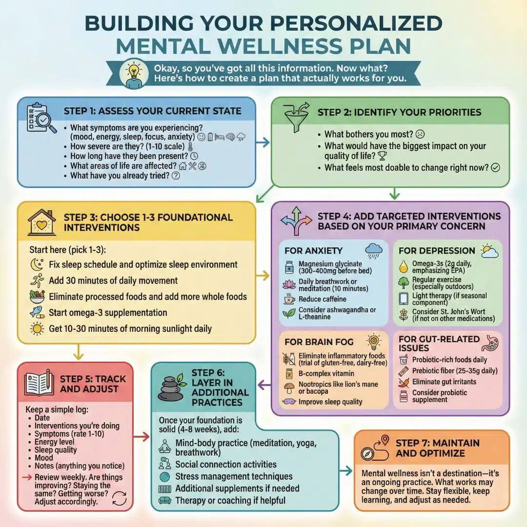 What surprised me most in researching this? How interconnected everything is. Your gut bacteria influence your mood. Your sleep quality affects your emotional regulation. The foods you eat literally become the building blocks of neurotransmitters that determine how you feel. Mental wellness isn’t one thing—it’s a symphony of biological, psychological, and social factors all working together.