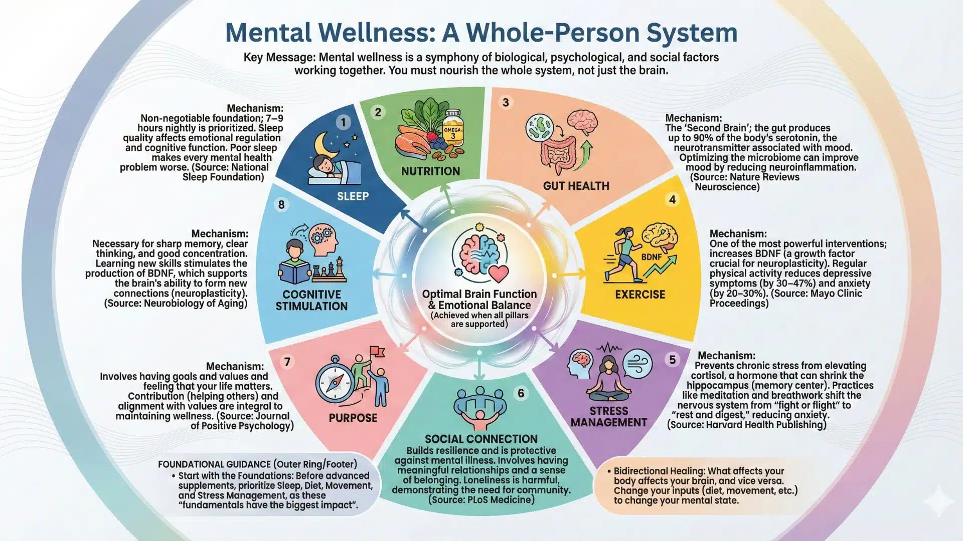 Mental wellness is multifaceted - all pillars work together to support brain health and emotional balance
