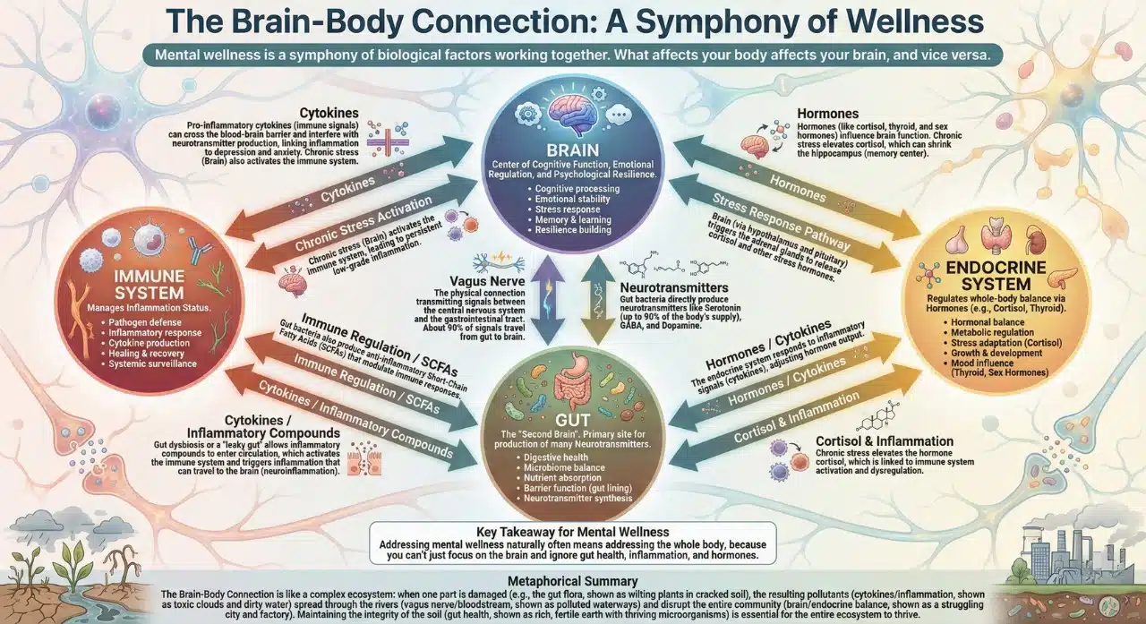 Your brain doesn’t exist in isolation. It’s constantly communicating with every system in your body through an intricate network of nerves, hormones, and immune signals. This bidirectional communication means that what affects your body affects your brain, and vice versa.